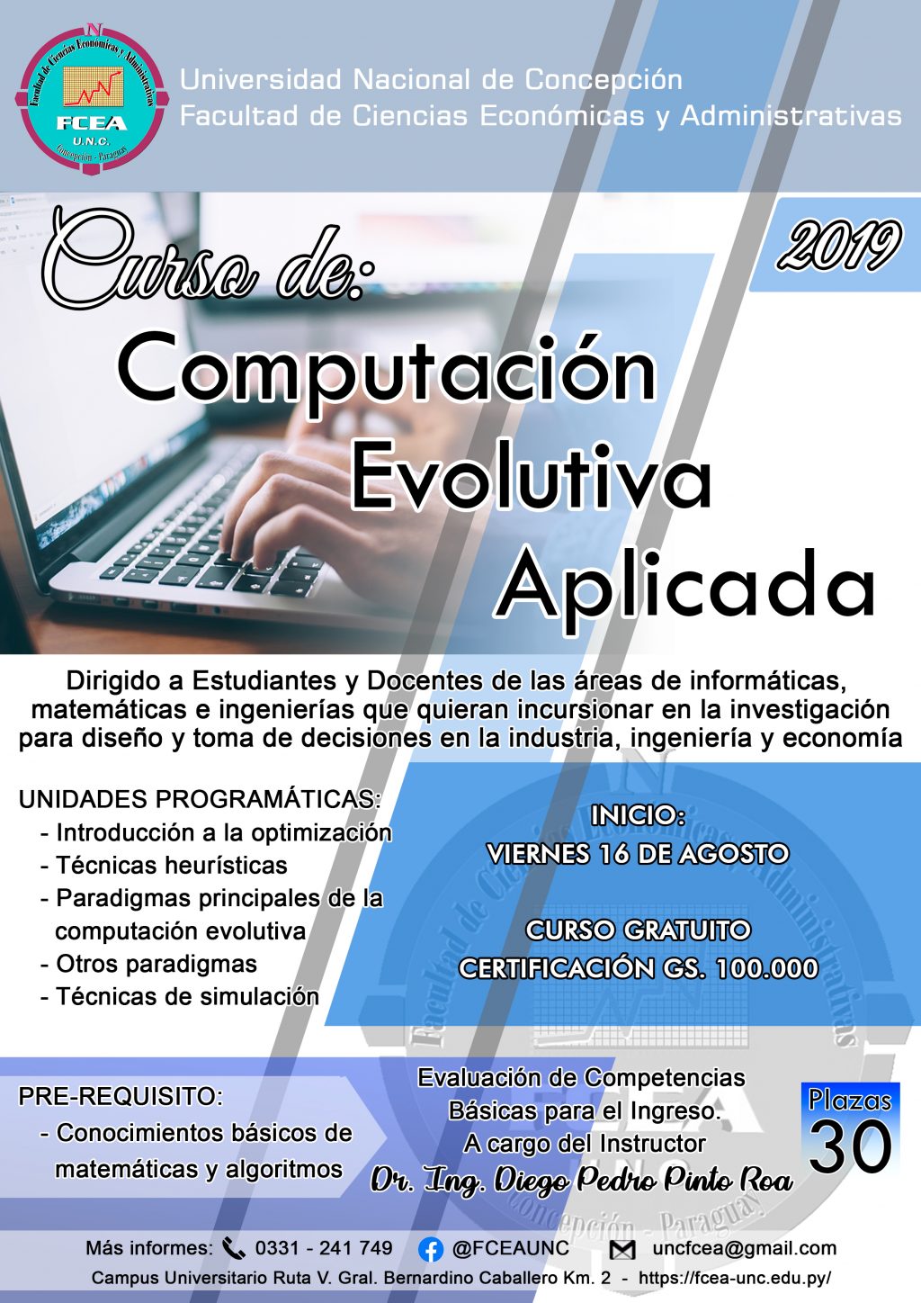 El desarrollo del Curso tendrá las siguientes características:• Local: Laboratorio de Informática FCEA – UNC.• Inicio: viernes 16 de agosto de 2019.• Horario: Viernes de 18:00 a 22:00 – Sábado